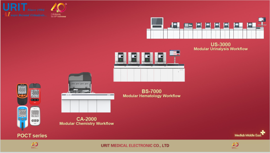 On the second day of the exhibition, the URIT International Marketing team will host a product launch and customer appreciation dinner at the Swissôtel Al Murooj Dubai. They will introduce products like the US-3000 series AI modular urinalysis workflow, BS-7000 series modular hematology workflow, CA-2000 automatic chemistry analyzer, and POCT devices, and hold an awards ceremony for nearly 100 outstanding global distributors in celebration of the company’s 40th anniversary.